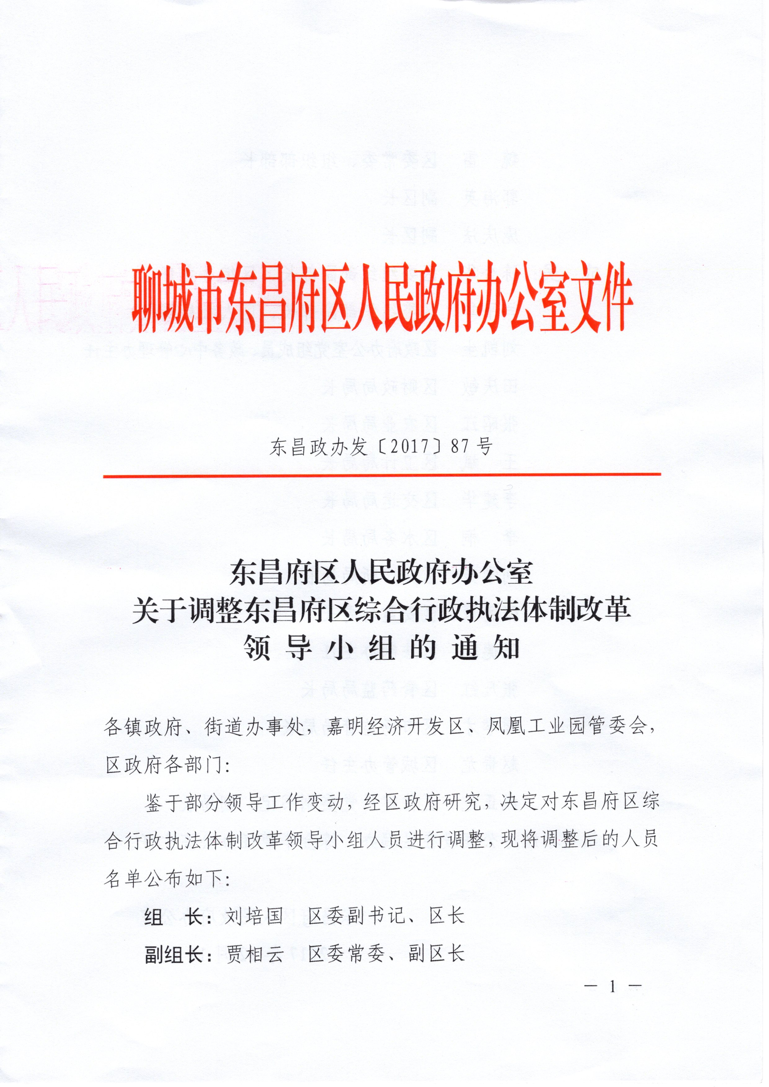 聊城市东昌府区人民政府办公室文件东昌政办发【2017】87号关于调整东昌府区综合行政执法体制改革领导小组的通知001
